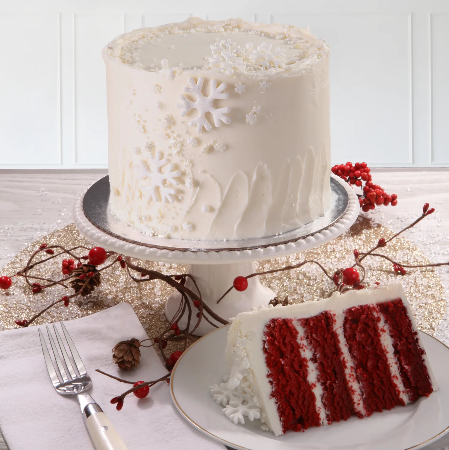 Celebrate the season with We Take The Cake’s festive Red Velvet Cake! This rich, red velvet cake is filled with a signature cream cheese filling and frosted with a smooth buttercream icing. Decorated with delicate snowflakes and a dusting of winter sparkle, it’s the perfect centerpiece for your holiday table—delicious, elegant, and full of holiday cheer.